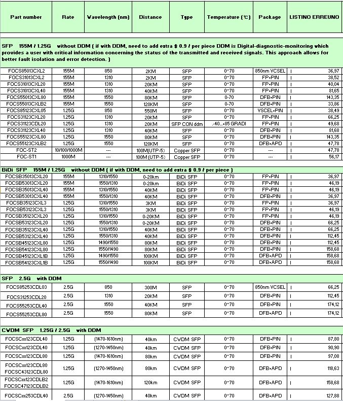SFP E BiDi per switch :alcuni codici e prezzi di riferimento per preventivo dettagliato inviare richiesta di offerta a info@erre1.it